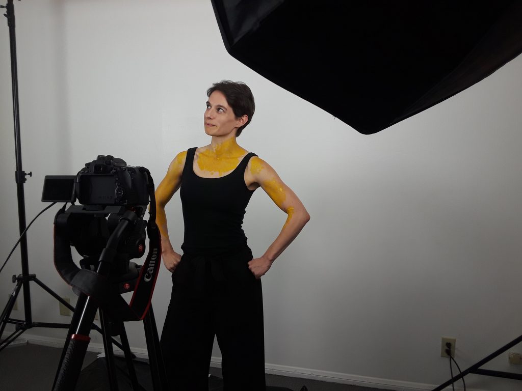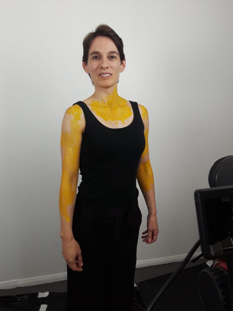 I had an absolute blast that day. As you can see, I was painted with yellow paint (the main symbol of the piece). I also painted on a canvas with the same yellow paint. I stared into a camera set not two feet from my face as I acted out different emotions. The best part was the dancing.