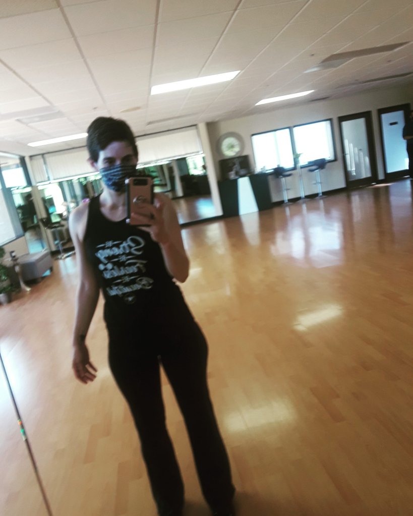 The butterflies quieted down as soon as I walked into the studio. Teacher and the studio manager were the only ones there. Both had masks and gloves on. I had put my mask on in the car after using my asthma inhaler. Even though all of our mouths were covered, I could see the smiles on their faces. Not overwhelming like “OMG, WE’RE SO GLAD YOU’RE HERE!’ More of a calm welcoming “we’re so glad you’re here and let us step back so you have space to come in.”